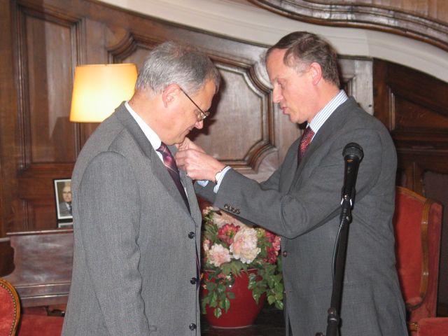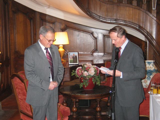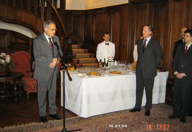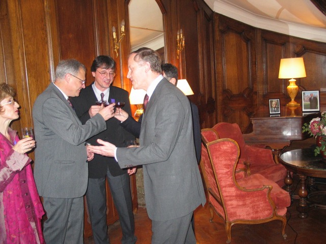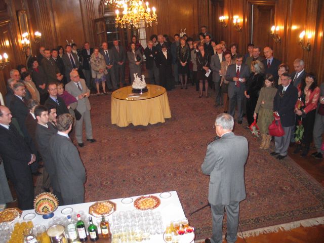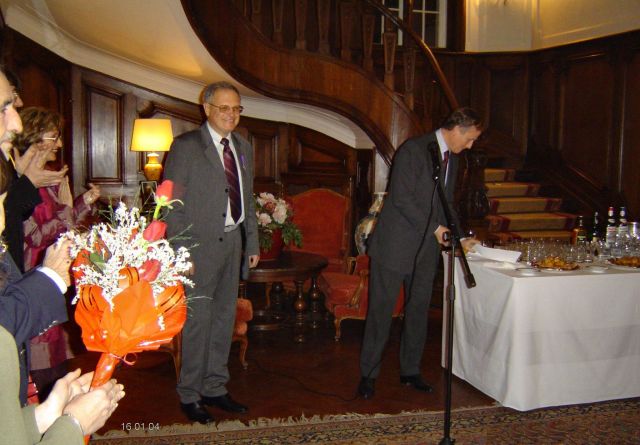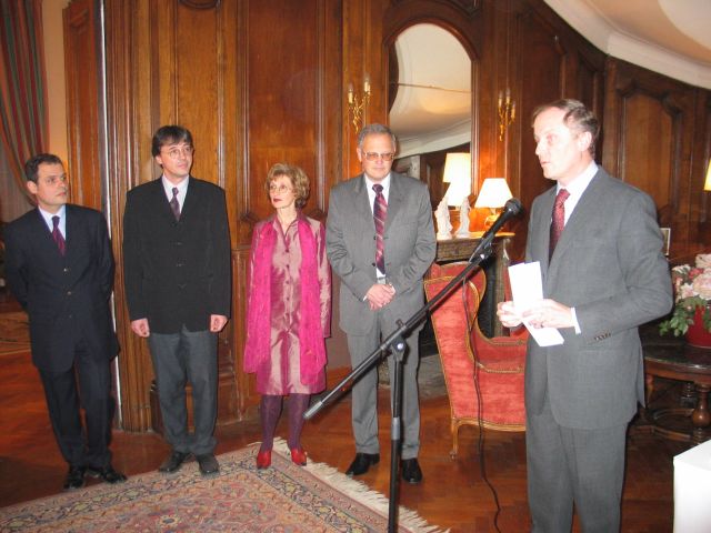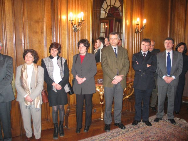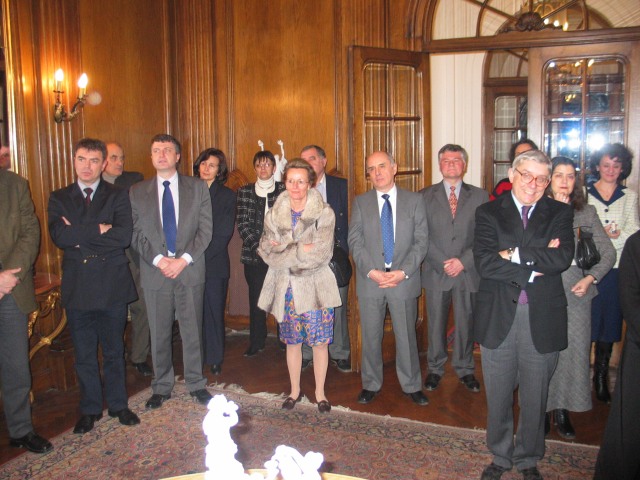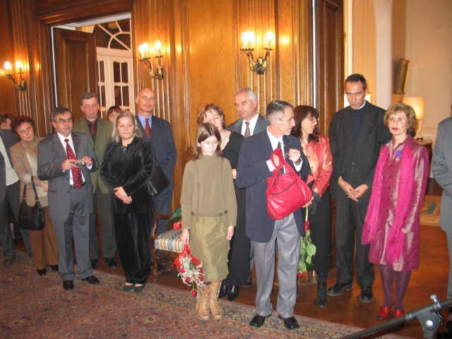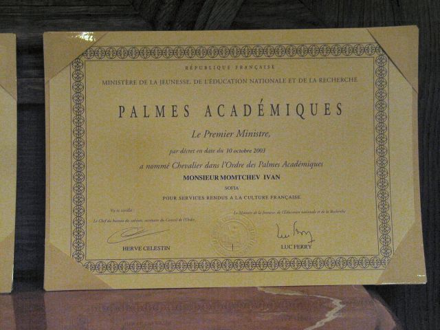 En vous décernant ces insignes des Palmes Académiques, créées par Napoléon, nous relions la tradition et la modernité, parce que le français trouve ainsi sa place dans l’ouverture de votre pays et son accession à l’Europe, parce l’originalité de votre usage de la francophonie renouvelle l’image du français. 2003 fut une année importante dans l'histoire des relations de la Bulgarie avec le monde de la Francophonie, et les filières francophones sont une des plus belles et des plus concrètes réalisations de la francophonie bulgare. L’Association, comme les filières, oeuvrent toujours pour faire du français une langue moderne, utile et professionnelle, c’est à dire une langue qui vit. Beaucoup d'entre vous nous font l'honneur de leur présence ce soir à double titre : à la fois éminents spécialistes du français et de la France mais encore membres de longue date de la section bulgare de l'AMOPA. Saluons, à cette occasion, Monsieur le Professeur Stoyan ATANASSOV, président de la section bulgare de l'AMOPA depuis toujours et récemment élu directeur du département d'études françaises de l'Université St Clément d'Ohrid de Sofia, et qui à travers ses fonctions successives est l’un de ceux qui contribue à cette modernisation que nous saluons aujourd’hui. Faisons honneur ce soir aux nouveaux chevaliers de l'Ordre des Palmes Académiques, à leur travail, à leur charisme, à leur amour du français et à leurs aspirations à moderniser leur société